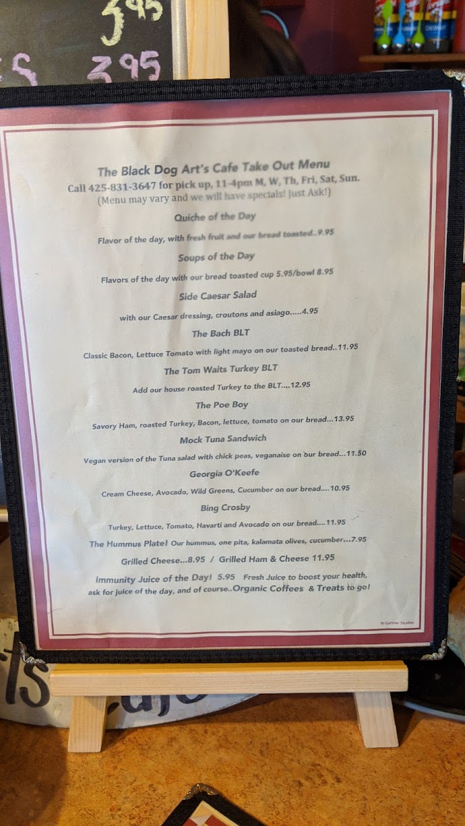 Welcome to The Black Dog, where community, cuisine, and creativity converge in the heart of Snoqualmie, WA. This charming café offers a thoughtful menu brimming with vegan and vegetarian delights, showcasing local and homemade ingredients. Notable dishes include their exceptional vegan breakfast burritos and the indulgent bakon and spinach scramble, both praised for their taste and freshness. Customers rave about the gluten-free options and homemade bread, ensuring there’s something for everyone.